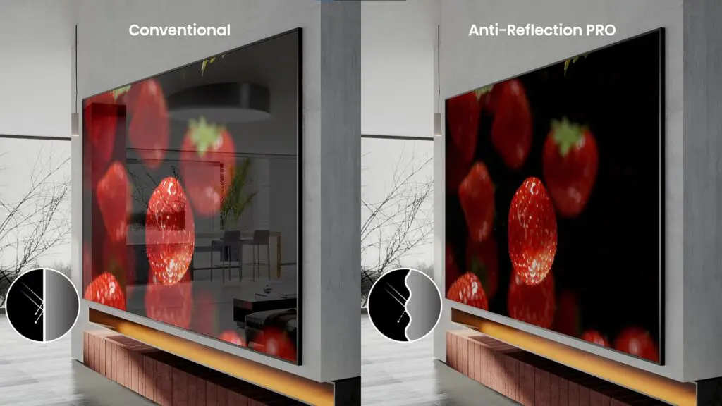 Specjalna powłoka w warstwie ciekłokrystalicznej minimalizuje odblaski, dzięki czemu obraz pozostaje żywy i szczegółowy przez cały dzień — i noc.